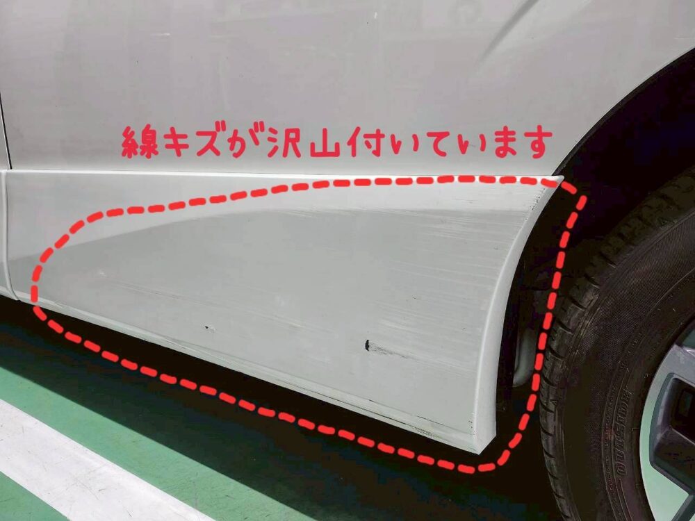 左のスライドドア~フェンダーまでに線キズがあります。